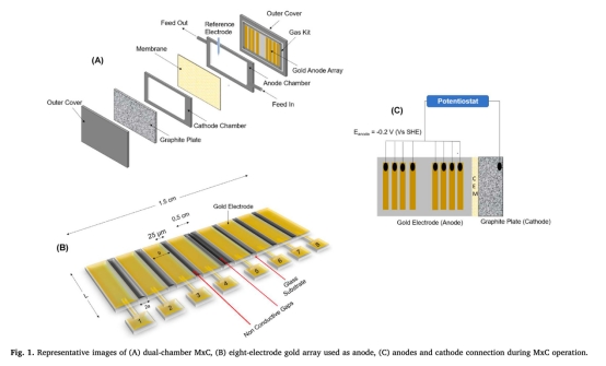 1. 實(shí)驗(yàn)設(shè)計(jì):構(gòu)建雙室MXC,采用八電極金陣列陽極(圖1A-C),分四階段操作:Phase 1(穩(wěn)態(tài)薄生物膜)、Phase 2(增厚生物膜)、Phase 3(乙酸饑餓)、Phase 4(底物恢復(fù))。