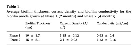 1. 厚度效應(yīng):當(dāng)生物膜厚度從19±1.7μm增至45±5.1μm時(shí),平均K_{\text{bio}}從0.63±0.4 mS/cm提升至1.43±0.16 mS/cm(圖4a),電流密度同步從1.15±0.12 A/m2增至2.1±0.02 A/m2(表1)。