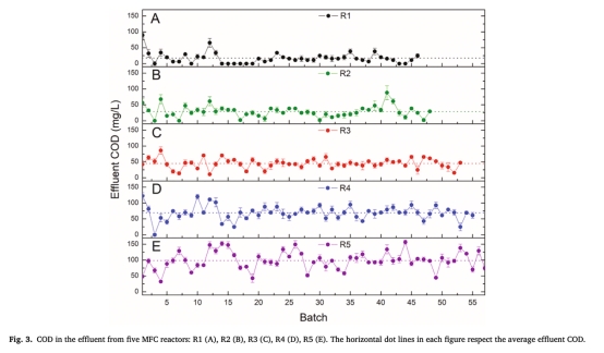? 數據:低COD/N組(R5)最大功率密度(1232.54 mW/m2)比無氮組(R1, 790.13 mW/m2)高56%,內阻降低44%(95.85 Ω vs 171.03 Ω)。