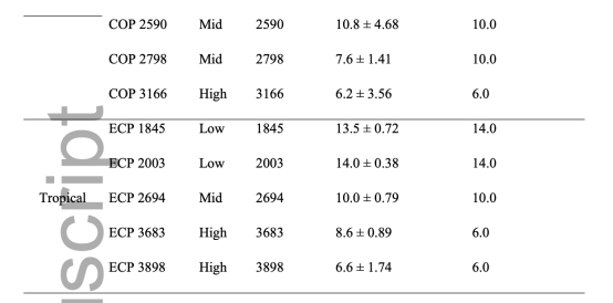 1. 配對海拔設計:在溫帶(美國科羅拉多州)和熱帶(厄瓜多爾納波省)選擇海拔匹配的溪流(高>3000米、中2500-3000米、低1000-2500米),確保采樣時水溫相近(表1)。