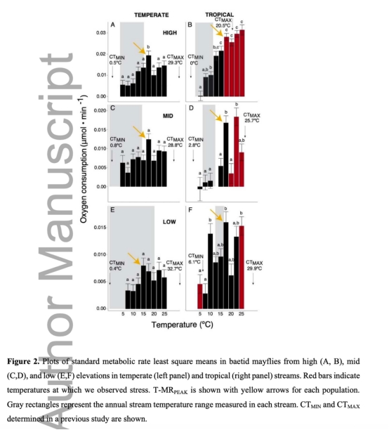 ? 數據:熱帶蜉蝣代謝率隨溫度上升更快(圖4A-C),高溫下出現明顯應激(圖2紅條);溫帶蜉蝣代謝響應平緩(圖2藍線)。石蠅無緯度差異(圖3,5)。