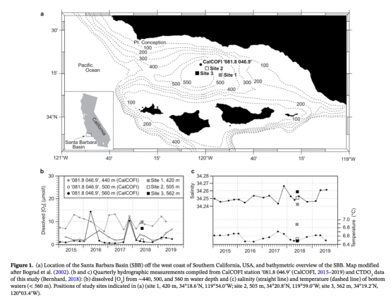 1. 樣本采集:在圣巴巴拉盆地三個低氧站點(水深420–567 m)采集沉積物巖芯和底層水樣本,測量原位溶解氧(丹麥Unisense微電極)和孔隙水金屬濃度。