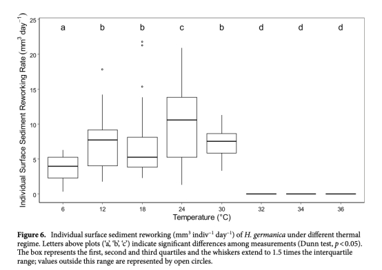 3. 生態(tài)系統(tǒng)功能影響:沉積物再加工率在24°C最高(10.1 mm3/個(gè)體/天),但在>32°C降至零;氧氣預(yù)算在熱浪下轉(zhuǎn)為負(fù)值,表明物種對(duì)沉積物混合和碳循環(huán)的貢獻(xiàn)被削弱。