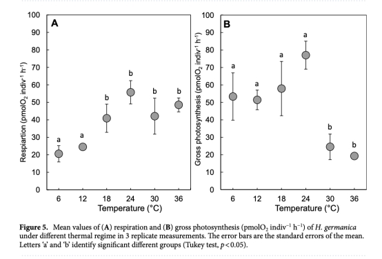 3. 代謝率數(shù)據(jù):包括氧消耗(呼吸速率)和光合作用(凈光合和總光合速率),使用Unisense微電極測(cè)量。這些數(shù)據(jù)來(lái)自Figure 5。研究意義是量化溫度對(duì)能量代謝的影響,揭示光合效率下降如何導(dǎo)致氧氣預(yù)算負(fù)值,解釋熱浪下物種生理壓力,并鏈接至生態(tài)系統(tǒng)尺度的氧氣通量和碳循環(huán)擾動(dòng)。
