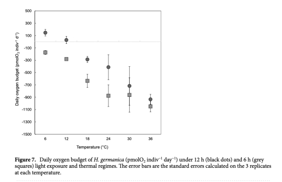 5. 氧氣預(yù)算數(shù)據(jù):計(jì)算每日氧氣平衡(基于光合和呼吸速率),考慮光照暴露時(shí)間(6小時(shí)和12小時(shí))。這些數(shù)據(jù)來(lái)自Figure 7。研究意義是量化有孔蟲(chóng)在生態(tài)系統(tǒng)中的凈氧氣貢獻(xiàn),顯示熱浪下氧氣生產(chǎn)轉(zhuǎn)為負(fù)值,凸顯其對(duì)底棲缺氧環(huán)境的潛在惡化作用。