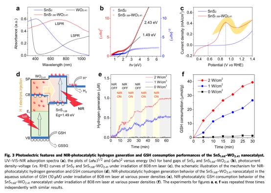 ? 數據:0.5 W/cm2 NIR照射下,H?生成速率達0.8 μmol/h,GSH消耗率>80%(30分鐘內)。