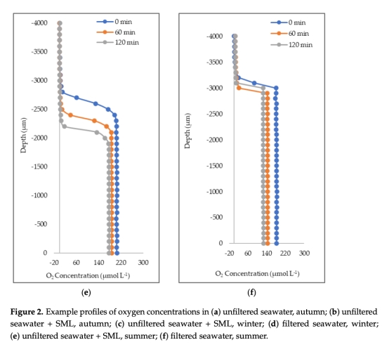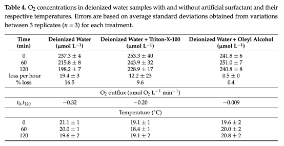 ? 數據:天然海水和去離子水的氧氣濃度隨時間變化(例如未過濾海水在120分鐘內損失10%氧氣)。