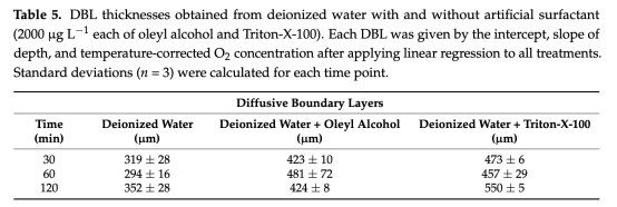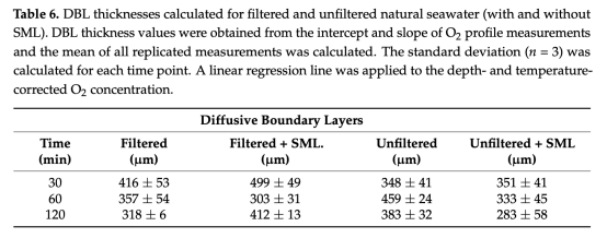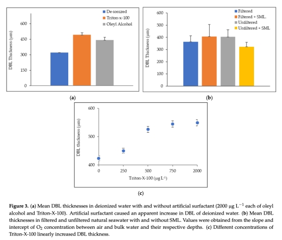 ? 數據:DBL厚度在添加SML后增至499μm(過濾海水)和283μm(未過濾海水);人工表面活性劑使DBL增厚30%(Triton-X-100)和26%(油醇)。
