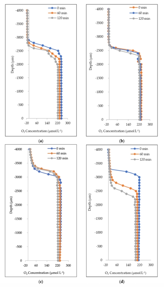 2. 氧氣擴散測量:使用丹麥Unisense微電極(OX-50和TP-200)原位測量氧氣濃度梯度(圖1),計算擴散速率和DBL厚度(表3-6)。