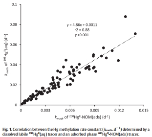 結果:1??Hg(aq)的k??平均比2??Hg-NOM(ads)高5倍(R2=0.88)。