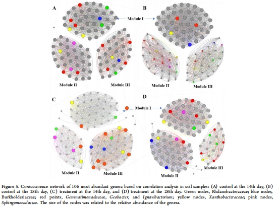 共現網絡顯示三類微生物形成緊密互作模塊(圖5C-D),nirK基因拷貝數顯著增加。
