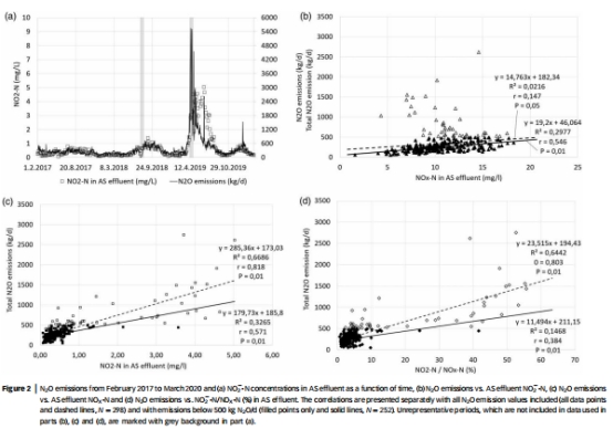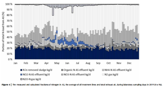 核心發(fā)現(xiàn):芬蘭Viikinm?ki污水廠多條活性污泥(AS)工藝線中,亞硝酸鹽(NO??)濃度異常累積(占NO?-N比例高達(dá)80%),觸發(fā)長期穩(wěn)定的亞硝化-反亞硝化路徑,導(dǎo)致 N?O排放量達(dá)進(jìn)水氮負(fù)荷的20%(圖1)。