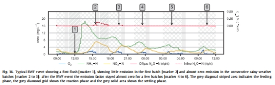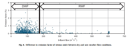 雨水事件影響:雨天流量(RWF)下排放因子降至0.09%,且后續干天流量(DWF)批次排放持續降低(圖8,14)。