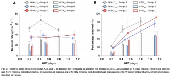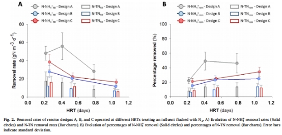 測試參數(shù):水力停留時(shí)間(HRT: 0.3–1.1 d)、進(jìn)水溶氧(N?沖洗 vs. 未沖洗)。