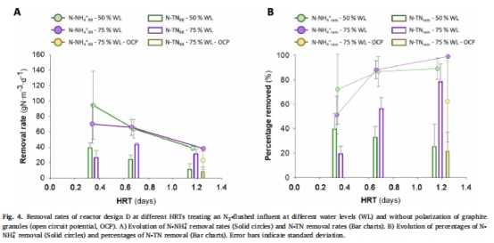 意義:量化系統(tǒng)脫氮能力。圖4B顯示D型在HRT 0.7 d時(shí)TN去除率達(dá)43±2 gN·m?3·d?1,表明極化石墨區(qū)提供了穩(wěn)定電子供體,替代傳統(tǒng)有機(jī)碳源。