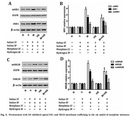 HS干預(yù)效果:腹腔注射HS(1/3/10 mL/kg)劑量依賴性抑制耐受(圖1),降低脊髓背角炎癥因子(TNF-α、IL-1β、IL-6)、星形膠質(zhì)細(xì)胞活化標(biāo)志物GFAP(圖3),減少谷氨酸轉(zhuǎn)運(yùn)體GLT-1和谷氨酰胺合成酶(GS)的硝化(圖4),并抑制NMDA受體NR1/NR2B亞基膜轉(zhuǎn)運(yùn)(圖5)。