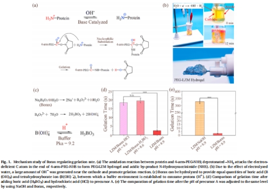 本研究提出一種基于中藥硼砂(Borax)的凝膠動力學(xué)調(diào)控策略,通過調(diào)節(jié)酰胺化反應(yīng)體系的pH環(huán)境,精準(zhǔn)控制PEG-溶菌酶(PEG-LZM)水凝膠的凝膠時間(3秒至數(shù)分鐘),同時保持水凝膠的物理性質(zhì)(如粘附強度、流變性能)不變。硼砂的加入提供堿性緩沖環(huán)境,促進(jìn)氨基去質(zhì)子化,加速酰胺鍵形成(圖1)。該策略賦予水凝膠雙重優(yōu)勢: