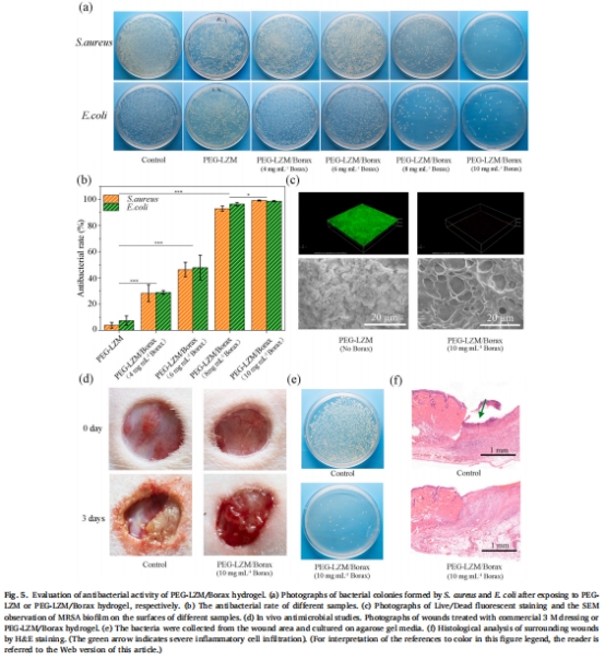 抗菌增效:硼砂的生物活性顯著提升水凝膠對金黃色葡萄球菌(S. aureus)和大腸桿菌(E. coli)的抑制率(圖5)。