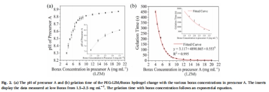 數(shù)據(jù):硼砂濃度從1.5 mg/mL增至20 mg/mL → 前體pH從7.42升至8.75(圖2a),凝膠時間從450秒縮短至3秒(圖2b)。