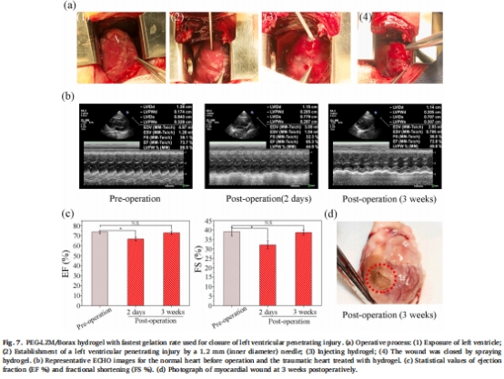數(shù)據(jù):硼砂水凝膠3秒封閉兔心室傷口(直徑1.2 mm),術(shù)后3周心功能(EF%和FS%)完全恢復(fù)(圖7b-c)。