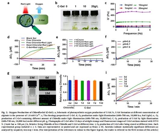 C-Gel:海藻酸鈉包裹小球藻形成凝膠(圖2a),保護小球藻活性并提升產氧效率(圖2d,i);
