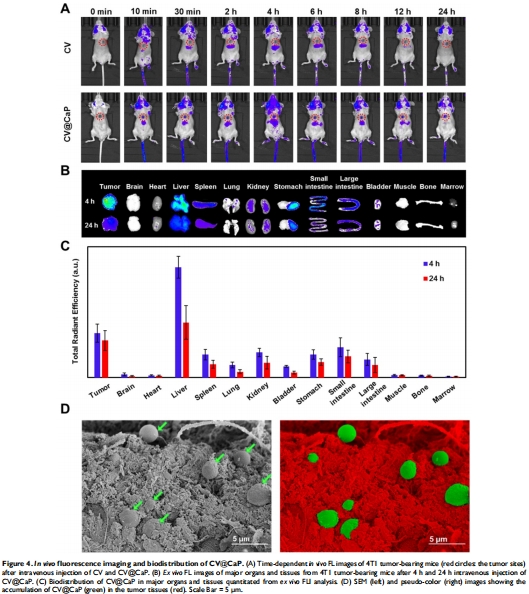 腫瘤靶向:靜脈注射4小時腫瘤熒光信號達峰值(圖4A)→ 意義:實時示蹤遞送效率,指導治療時間窗。