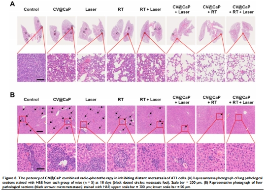 肺/肝轉移抑制:CV@CaP+RT+Laser組無可見轉移灶(圖8A-B)→ 意義:系統(tǒng)治療抑制遠端轉移。