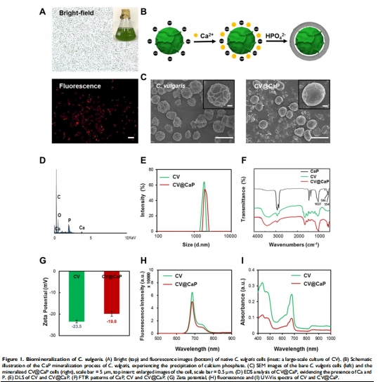 生物礦化包覆:CaP層保護微藻(圖1B),提升體內穩(wěn)定性(SEM/TEM驗證,圖1C)。