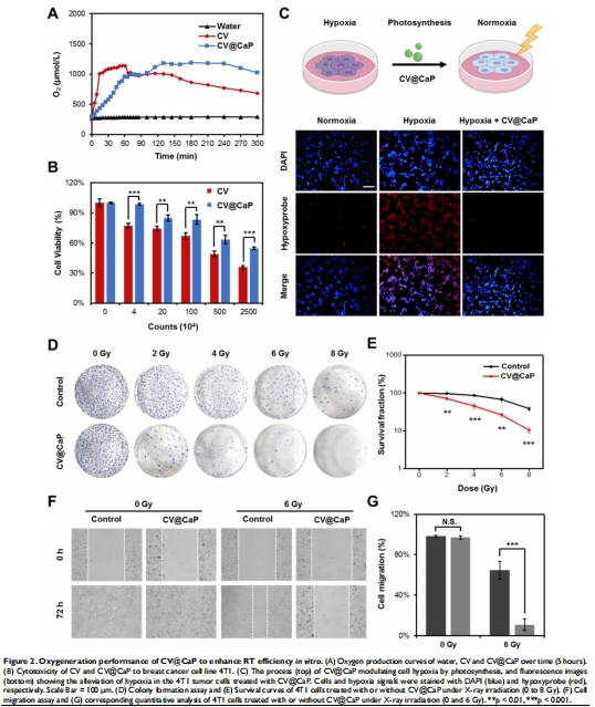 本研究開發(fā)了一種 鈣磷酸鹽(CaP)工程化的光合微藻系統(tǒng)(CV@CaP),用于解決腫瘤放療中的缺氧問題: