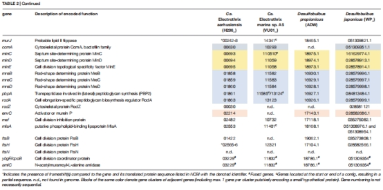 基因組尺度:比對電纜細菌與近緣菌(Desulfobulbus)的細胞分裂基因簇(表2)。