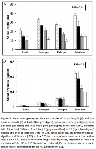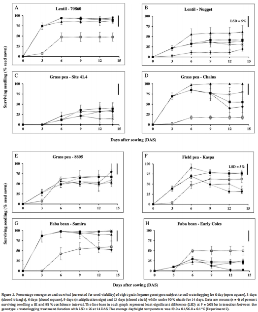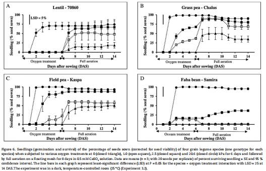 本研究評估了草豌豆(3基因型)、小扁豆(2基因型)、蠶豆(2基因型)和豌豆(1基因型)在萌發期對澇漬、低氧(1.0/2.5 kPa氧分壓)和無氧(氮氣環境)的耐受性差異: