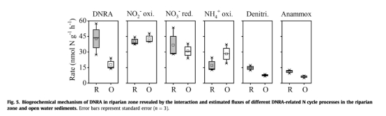 ? 數據:河岸帶DNRA速率(35.28±5.56 nmol N g?1 h?1)為開闊水域的2倍,夏季速率高于冬季。