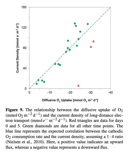? EP電極(500 μm分辨率)首次捕獲沉積物內(nèi)電流密度動態(tài)(峰值128 e? mmol m?2 d?1),建立電流密度與O?消耗的定量模型(Fig. 9),為電活性生物地球化學(xué)提供實證。