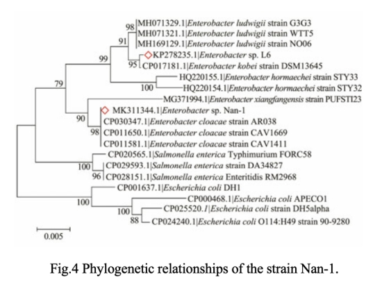 ? 通過(guò)16S rRNA基因序列(MK311344)和系統(tǒng)發(fā)育樹(shù)鑒定為Enterobacter sp. Nan-1(圖3-4)