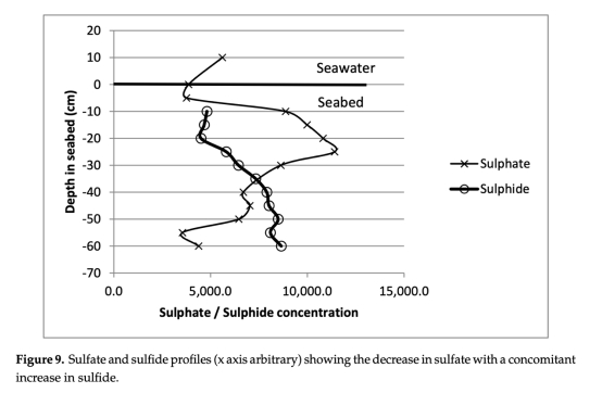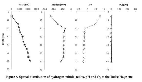 ? 數(shù)據(jù):H?S峰值達(dá)2194 μM(深層),pH降至<6.8,硫酸鹽在25-60 cm深度顯著消耗(圖9)。