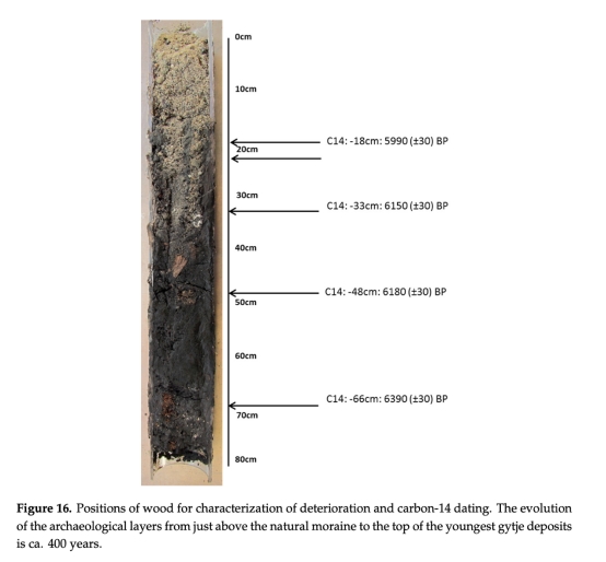 ? 對(duì)巖心中的木質(zhì)碎片(圖16)進(jìn)行碳14定年及降解程度分析,關(guān)聯(lián)環(huán)境參數(shù)與文物實(shí)際保存狀況。