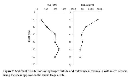 ? 數(shù)據(jù):DO在沉積物5 cm深度耗盡,H?S濃度隨深度增加(10-60 cm),氧化還原電位降至-145 mV。