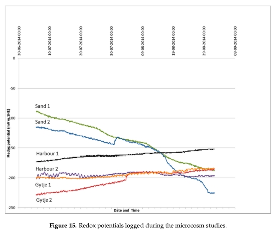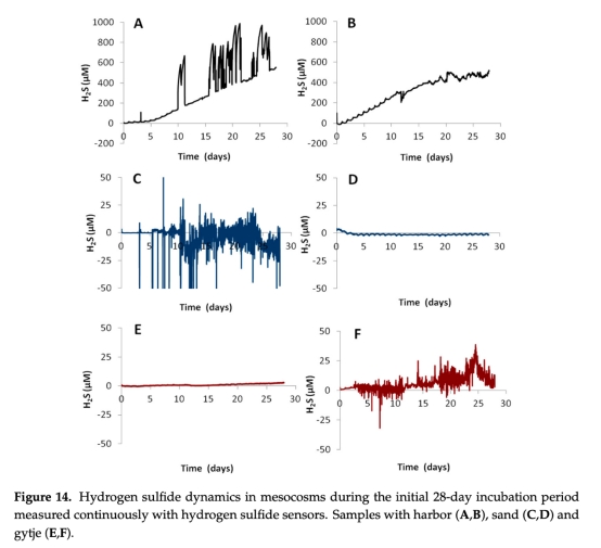 ? 數(shù)據(jù):港口沉積物H?S產(chǎn)量最高(1927 μM),沙層最低(43.5 μM);氧化還原電位穩(wěn)定在-250 mV(圖15)。