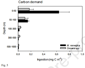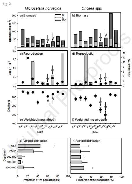 M. norvegica聚集在表層(0-100 m),Oncaeaspp.分布于深層(>100 m)。