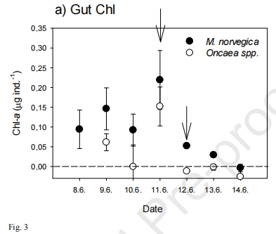 胃葉綠素:M. norvegica(0.09±0.08 ng chl-a ind.?1)顯著高于Oncaeaspp.(圖3)。