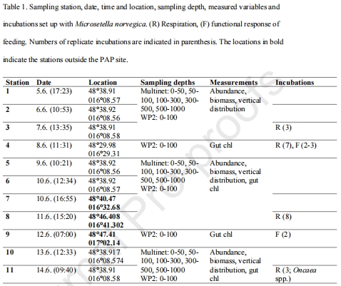在PAP站位(東北大西洋)10天內(nèi)進(jìn)行8次采樣,對比不同水文條件下橈足類響應(yīng)(表1)。