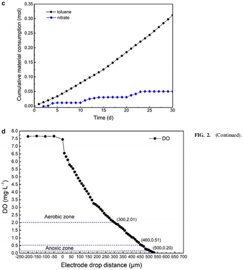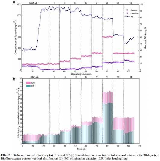 圖2:甲苯去除性能與生物膜氧分布(含Unisense數(shù)據(jù))