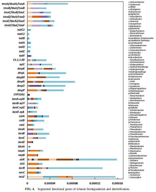 反硝化基因豐度最高(0.0549%),其次為甲苯單加氧酶基因(0.0284%);