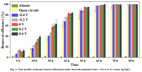 微氧條件(DO=282±20 μmol/L)下,+0.4 V電極電位使苯酚降解速率提升59%,降解時間縮短至66小時(圖3);