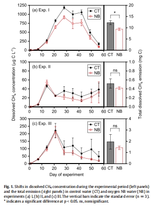 數(shù)據(jù):納米氣泡水使總?cè)芙釩H?排放減少20-28%,其中實(shí)驗(yàn)I減排24%且顯著(圖1a)。