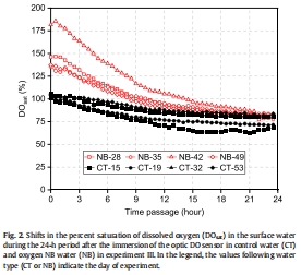 數(shù)據(jù):納米氣泡水初始DO飽和度更高,但24小時(shí)內(nèi)降至與對(duì)照相近水平(圖2)。