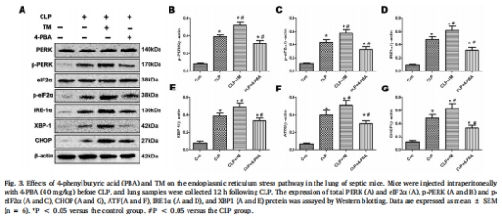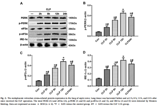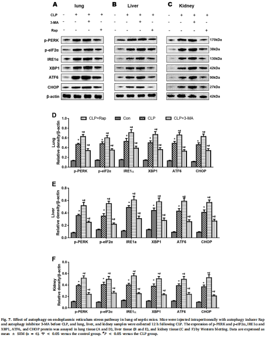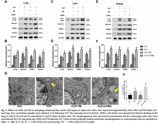 膿毒癥模型(盲腸結扎穿孔術CLP)激活ERS通路(PERK/eIF2α磷酸化、IRE1α↑),抑制自噬活性(LC3Ⅱ/Beclin1↓)(圖2-4)。