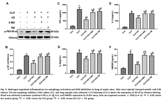 機制核心:氫氣通過激活自噬抑制ERS,進而降低炎癥因子(TNF-α/IL-6/HMGB1↓)和器官功能障礙(圖7-9)。