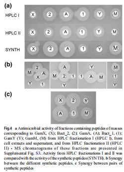 從細胞提取物和上清液中純化肽(圖2, 3),化學合成6種肽(GamA、GamX、Bact_1、Bact_2、GamM、GamY)。