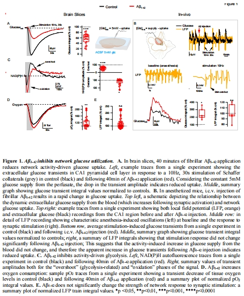 Aβ抑制糖酵解(NAD(P)H超射↓)但增強(qiáng)氧化磷酸化(氧耗↑)(圖1C-D)。